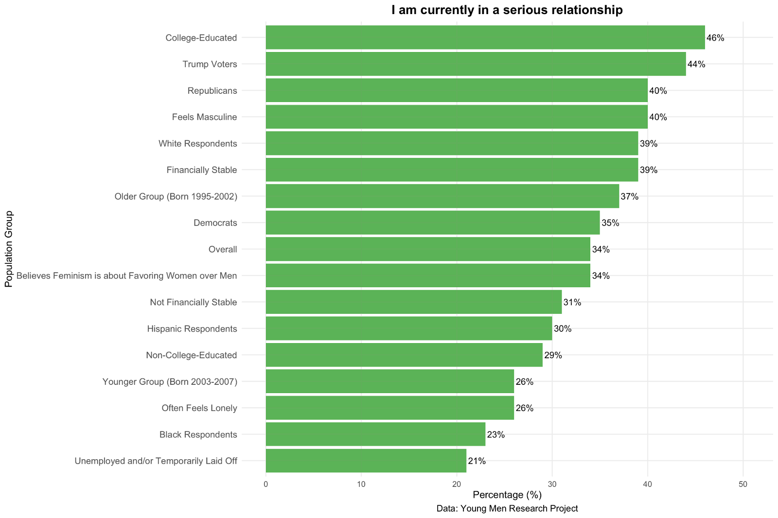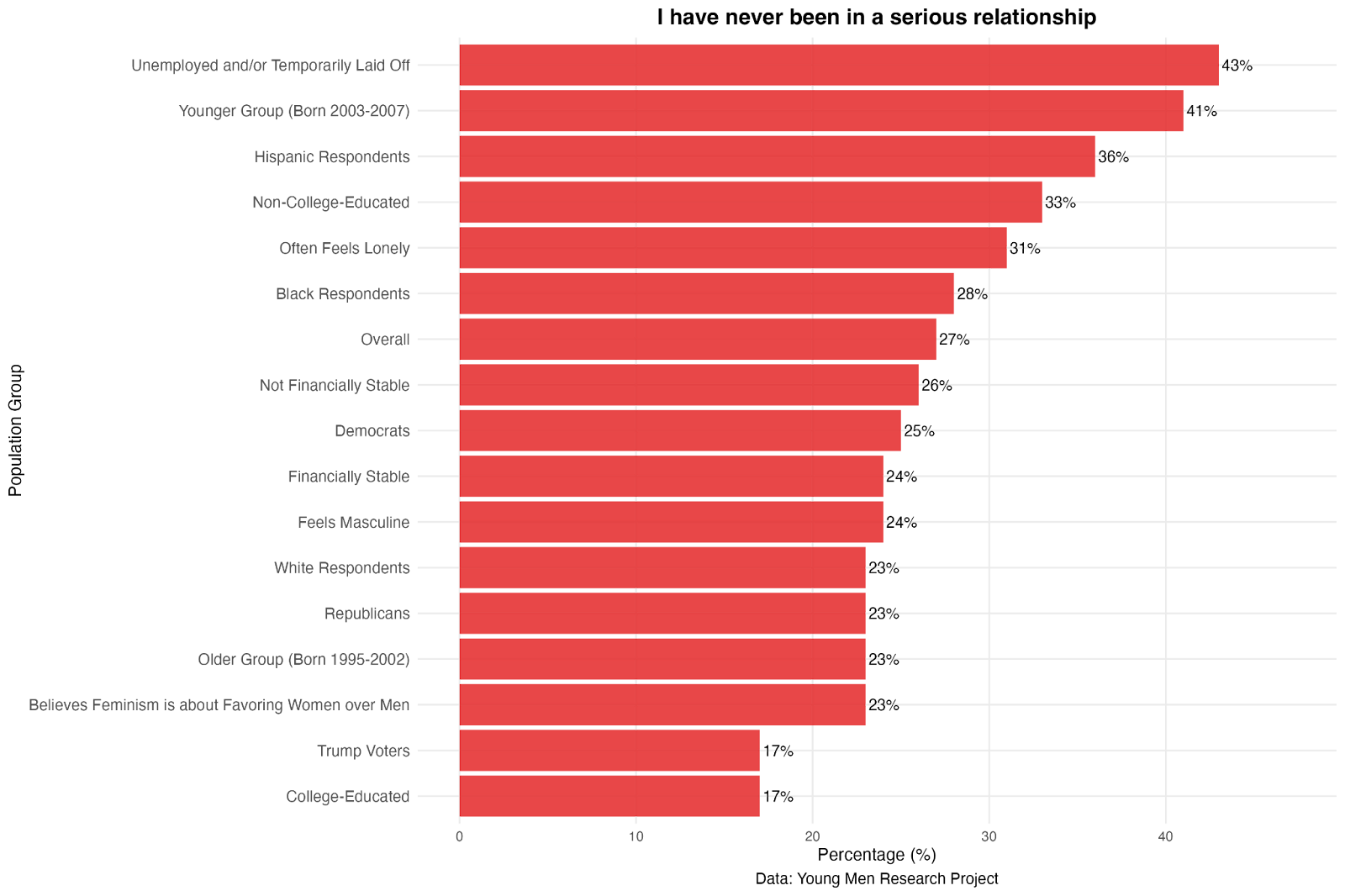 43 percent of unemployed or temporarily laid-off young men have never committed to a partner, the highest rate among groups examined. Unsurprisingly, about two in five men (41 percent) in the younger cohort, those born between 2003 and 2007, have never been in a serious relationship, compared to 23 percent of their older peers.