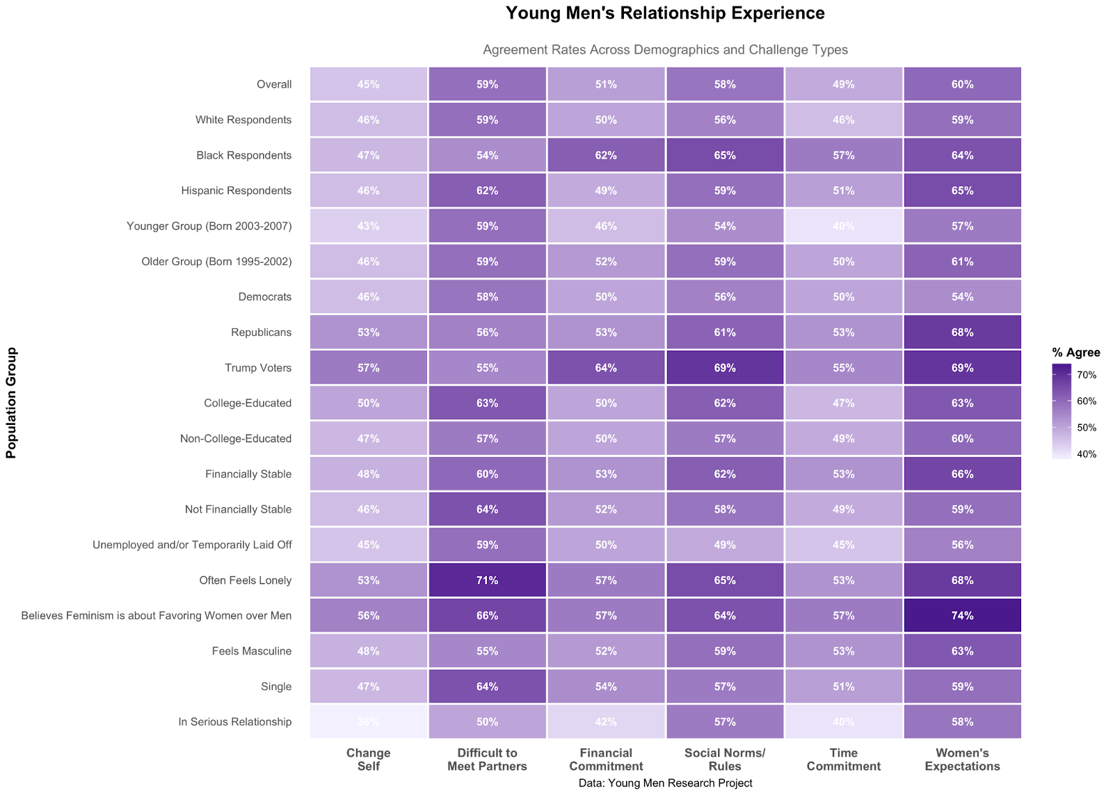The lower relationship rates among young Black men appear to be partially explained by heightened scrutiny of practical barriers. This group is eleven percentage points above average in viewing relationships as too financially demanding (62 percent versus 51 percent average), and eight percentage points above average in seeing dating as too time-consuming (57 percent versus 49 percent average).