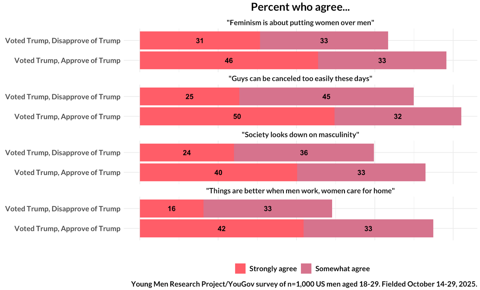 This decline has been smaller among 2024 Trump voters. In May 2025, Trump-voting young men approved of the president by 79-18 (+61 on net), down to 77-21 (+56 on net) as of November.
