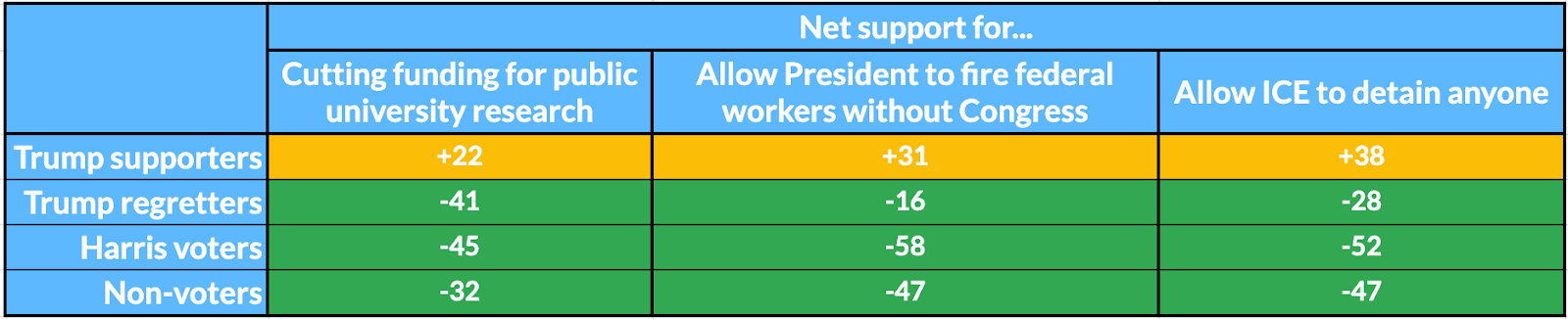 Trump regretters also disagree with several key Trump policies. The largest differences between regretters and supporters were on policies like: